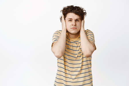 Distressed curly guy shut his ears and looking troubled, having probem, standing annoyed against white background