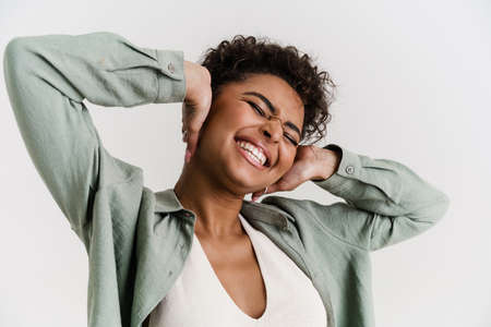 Young black woman in shirt laughing and covering her ears isolated over white background