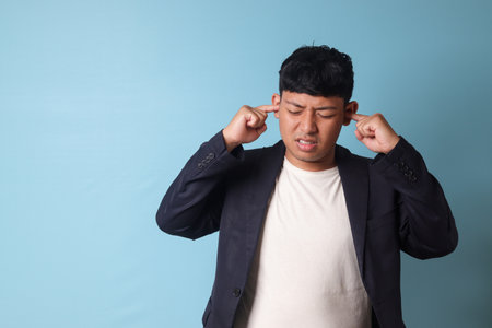 Portrait of young Asian business man in casual suit overwhelmed with noises and while closing ears with both hands. Isolated image on blue background