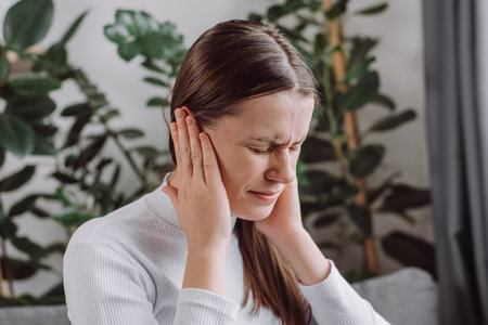 Girl in her mid 20's covering ears, suffering from loud noise, unhappy female feeling pain