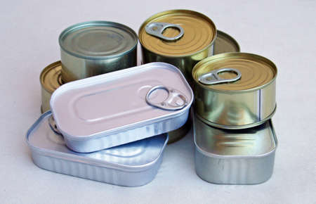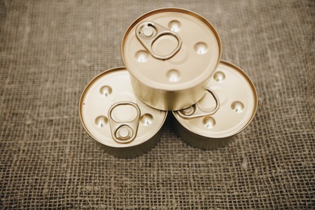 Tin cans with conserved food on gray surface