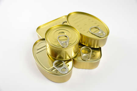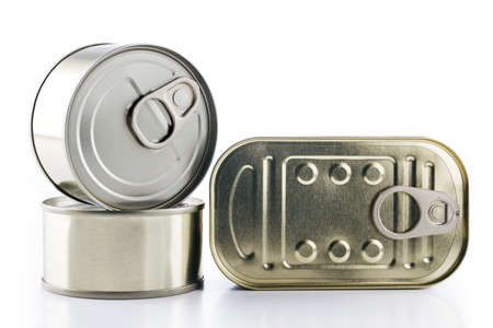 Tin, canned food isolated on white. Stock and proviant concept. Long-term storage products