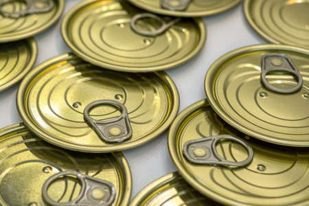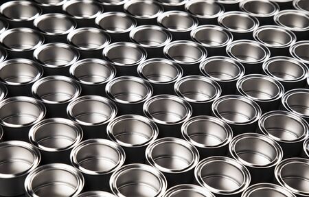 Many closed tin cans on white background. metal cans for fish and meat products