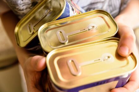 Canned meat packs as a quarantine stock reserve on wooden background