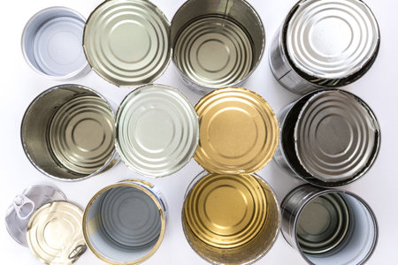 empty canned cans for recycling. On white background, top view.