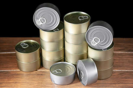 Closed food tin cans on dark background