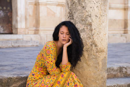 beautiful woman with dark curly hair leaning against the wall and the window grille of a typical Mediterranean style house. The woman is serious and sad. Concept expressions.