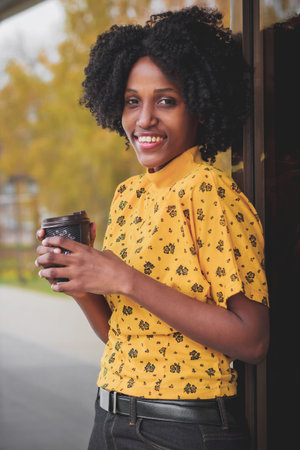 Young dark-skinned woman dressed in casual clothes holding cup of hot drink, enjoying coffee