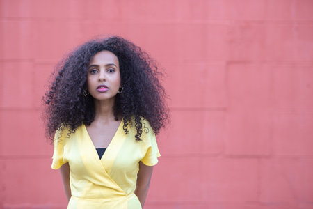 Fashion portrait of an African woman wearing hoop earrings, against a textured pink backdrop.