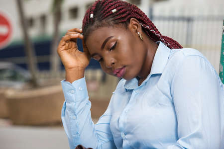 Beautiful African woman outdoors. Happy black woman sitting on colorful street