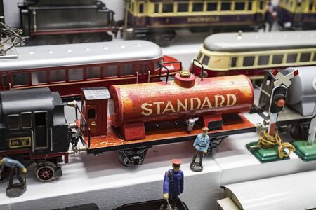 MILAN, ITALY - SEPTEMBER 13: Vintage tinplate toys on display at HOMI, home international show and point of reference for all those in the sector of interior design on SEPTEMBER 13, 2014 in Milan.