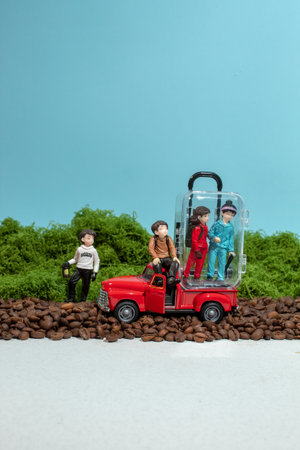 Miniature people go hiking in a pickup truck on surface of coffee beans.