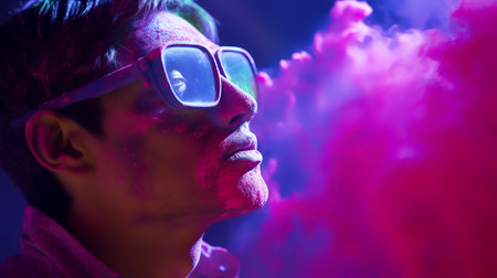 Portrait of a young man wearing sunglasses and looking at the camera while standing against colorful smoke background
