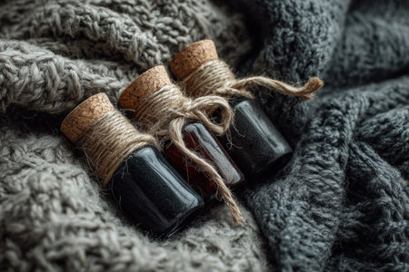 Three small honey jars, elegantly tied with twine, are placed on a soft knitted blanket, highlighting a minimalist aesthetic and natural elements for culinary inspiration