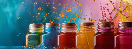 A dynamic and colorful image of paint jars splashing with vibrant droplets, captured in mid-air, creating an energetic and artistic visual with a blend of bold colors.