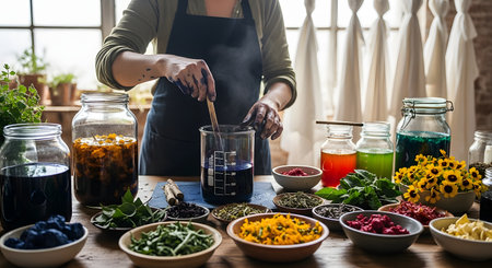 An artisan mixes natural dyes in a glass beaker surrounded by jars of colorful plant-based liquids and fresh herbs. The person wears an apron and works at a wooden table, illustrating the process of sustainable, eco-friendly textile dyeing.