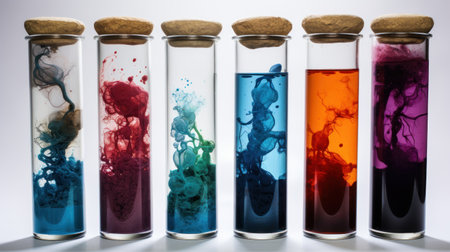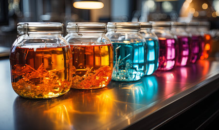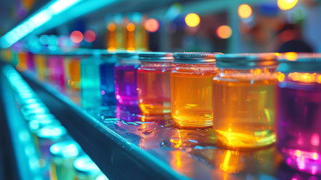 Illuminated jars with colorful liquids on reflective surface. Multicolored laboratory vials in neon lighting. Concept of chemical research, science technology, laboratory environment