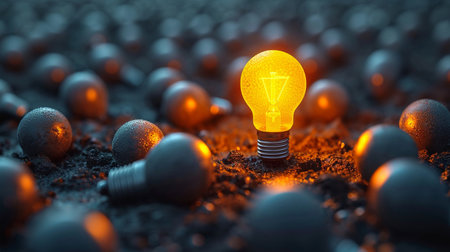 light bulb alone in front of group of other globes shot at shallow depth of field, concept of unconventional or unique ideas