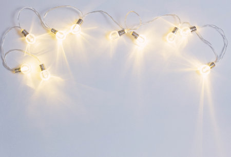 Retro christmas garland with lighted lamps over white marble background. Flat lay, space