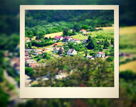 Miniature tilt-shift aerial view of the village in Alps, Switzerland
