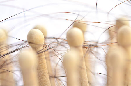 a tuft of brown hair tangled at the top on a light white background. texture or background for a hair salon