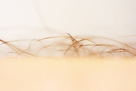 Background with brown hair tips. The tips of the hair stick out from the bottom or top on a light gray background. Curls of hair on the edge of the frame on a white background
