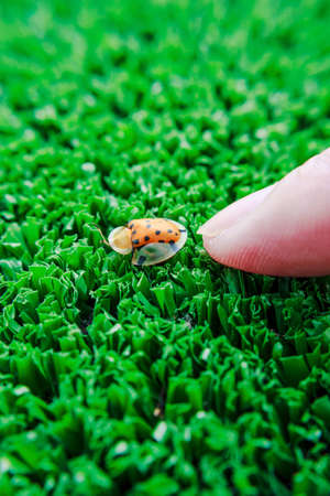 Closeup of Lady bug on thumb with lawn background