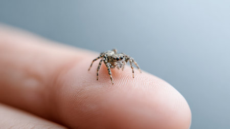 Tiny jumping spider exploring a fingertip, showcasing its delicate features and unique markings against a soft blue backdrop, highlighting the wonders of natures miniature creatures