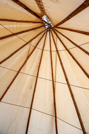 Close up of teepee tent top made of canvas and wood beams. Tee pee tent set up for camping. Interior of wigwam traditional tent.