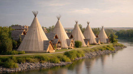 Capture the essence of a heritage village featuring traditional teepees along a tranquil riverbank, beautifully illuminated by soft sunlight, perfect for cultural exploration.