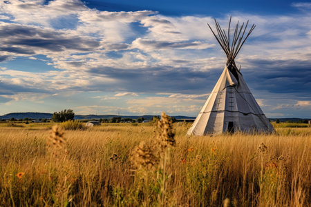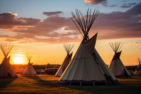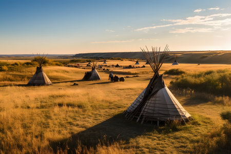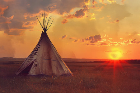 Tribal teepee in the prairie at sunset, South Dakota, First Nations tipis on the open prairies of North America, AI Generated
