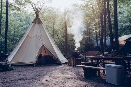 Cozy forest campsite featuring a large canvas tipi, smoke from a fire, wooden benches, and camping essentials surrounded by lush greenery