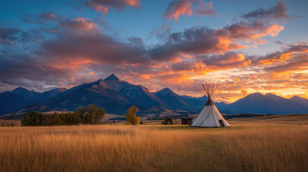 A stunning landscape featuring a traditional teepee set against majestic mountains during a vibrant sunset, highlighting the beauty of nature and culture.