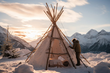 Man builds wigwam in winter mountain slope with stunning winter nature view
