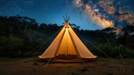A tent with light in forest on mountain at night with starry milky way galaxy in the sky for outdoor adventure lifestyle, camping product background