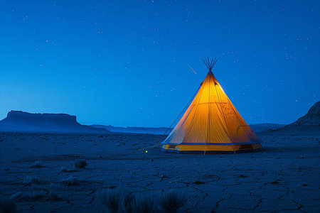 A serene tepee encampment is illuminated by stars and moonlight, creating a tranquil atmosphere on a prairie. Native American pottery blends with desert sands under a twilight sky.