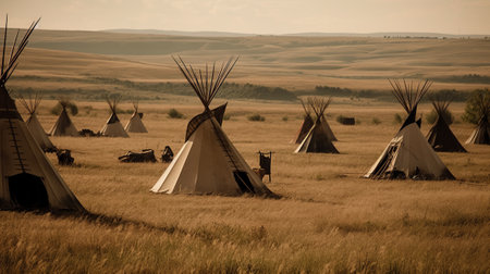 Pastoral Tipis north America field. Traditional conical lodge tents wild village. Generate ai
