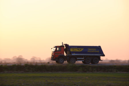 Tipper truck driving on a highway shortly before dawn, creating a play of light with the sun.