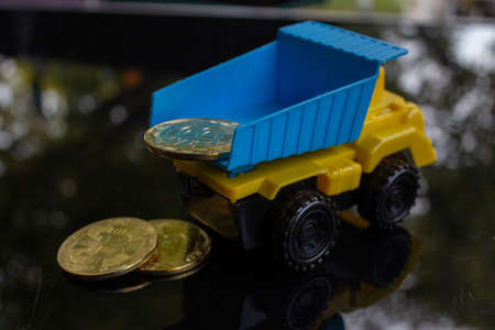 A yellow turquoise colored toy truck carrying and dropping off some bitcoins.