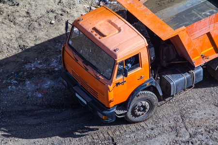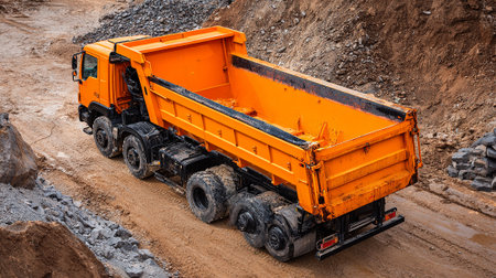 An elevated perspective reveals an orange dump truck on a dirt-covered construction site. The truck is surrounded by earth, rocks, and rubble, highlighting construction and industrial theme, emphasizing the vehicle's role.