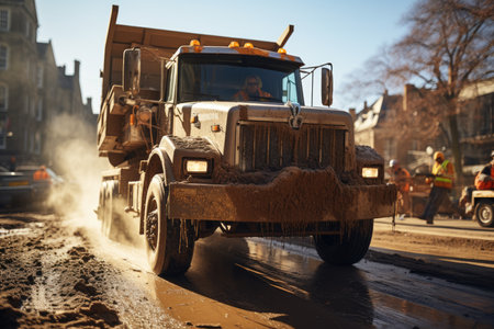 A dump truck is driving through a rainstorm. The rain is falling in large drops, creating a wet and slippery surface. The truck is the main focus of the image with Generative AI
