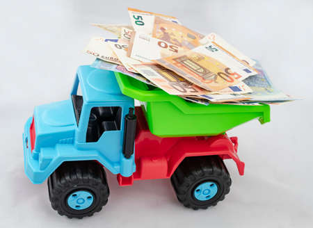 Colorful plastic truck carries a large number of 50 and 20 Euro bills on top of it
