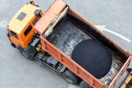 Heavy industrial dump truck unloading hot asphalt .City road construction and renewal site