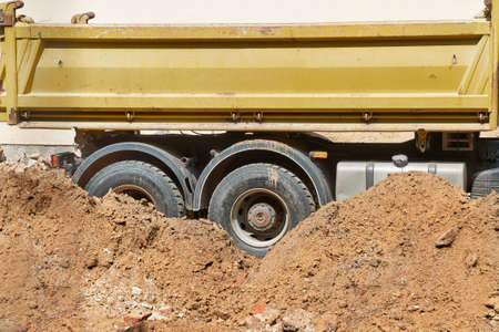 The dusty truck with a red body which exports construction debris soil and bricks from the building site.