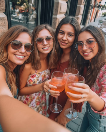 Photo of best friends recreat together during summer holidays share photos in social networks pose for making selfie hold fresh cocktails People vacation friendship and l : Generative AI