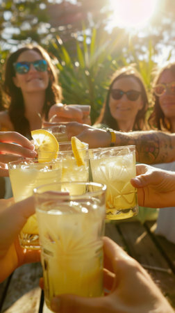 Group of women toasting with lemonade in a sunny garden. Perfect for summer parties.