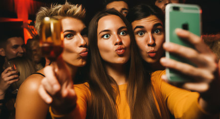 woman influencer taking a group selfie at a party, fun vibe, party lights background in the club with glitter