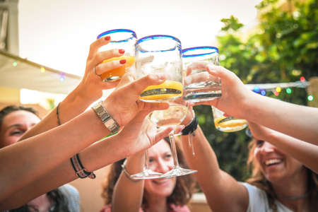 Group of happy friends cheering with glasses at dinner outdoor in terrace. Female people having fun while drinking and eating in a summer evening. Family lifestyle, friendship and togetherness concept