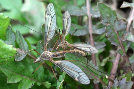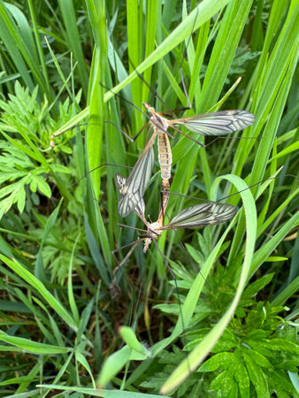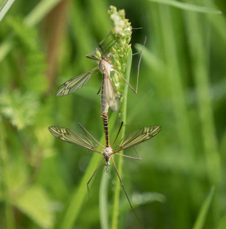 Close up of two crane flies (Tipulidae) having sexual intercourse hidden in the green grass in nature