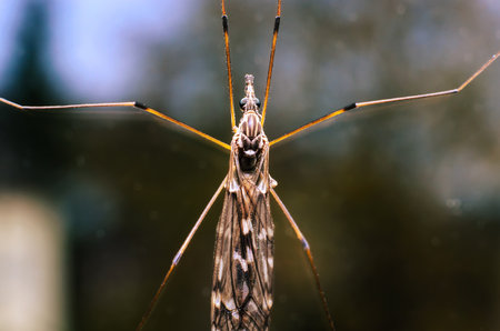 Close-up macro photo of a crane fly sitting on glass, showing its long legs, delicate wings, and detailed body texture. Ideal for insect, macro, and nature concepts.